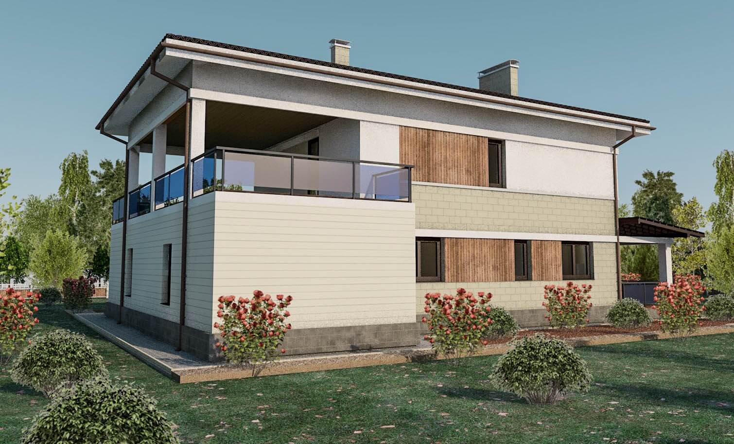 Проект "АБ - 0513" - хороший двухэтажный дом для постоянного проживания из арболитовых блоков с террасой, с гаражом. Площадь гаража 250.00 м2 с размерами 14 на 12.